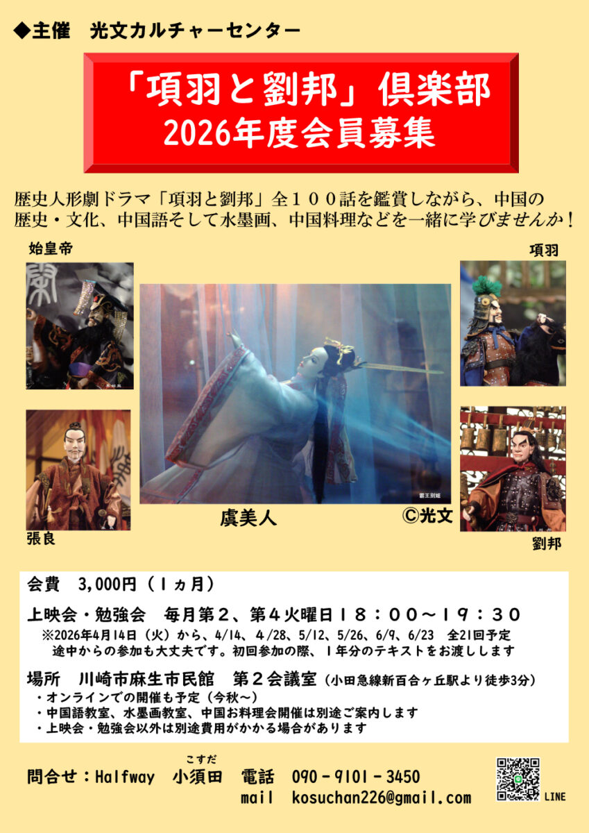 歴史人形劇ドラマ「項羽と劉邦」全100話を鑑賞しながら、中国の歴史・文化、中国語そして水墨画、中国料理などを一緒に学びませんか!